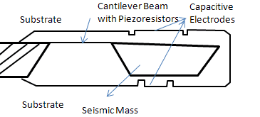 在MEMS加速度傳感器中,敏感元件是差分電容器的梳狀結(jié)構(gòu),該電容器并聯(lián)布置在由從硅襯底蝕刻的彈簧支撐的梁(形成地震質(zhì)量)上。差分電容器形成由高頻方波發(fā)生器驅(qū)動(dòng)的電容性半橋。當(dāng)垂直于地震質(zhì)量施加加速度時(shí),差分電容器不匹配,并且中心板上出現(xiàn)非零電壓。該信號(hào)被預(yù)放大,解調(diào),放大并作為與施加的加速度成比例的電壓輸出。