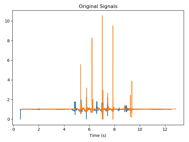 現(xiàn)在我們有兩個(gè)具有相同采樣率的信號(hào),我們必須確定兩次記錄開始之間的時(shí)間偏移。這個(gè)問題可以被定義為尋找最佳信號(hào)一個(gè)偏移噸 ∈( - LEN(信號(hào) 1),LEN(信號(hào) 2))? ?由一些度量,其最好的同步重采樣信號(hào)。我們還允許用戶指定兩個(gè)信號(hào)之間的最大起始時(shí)間偏移,以防止由一個(gè)信號(hào)中的最后幾個(gè)采樣與另一個(gè)信號(hào)中的前幾個(gè)采樣很好地同步引起誤報(bào)的可能性。