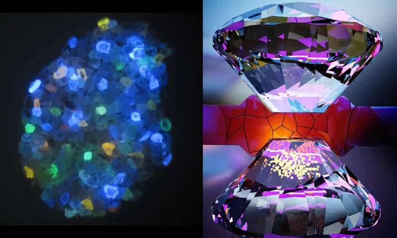 左圖是天然鉆石由于其不同的氮空位(NV)中心而在紫外線下發(fā)光。右側(cè)是示意圖,顯示了正在運行的金剛石砧,NV中心位于底部砧。NV傳感器在被激光激發(fā)時會發(fā)出明亮的紅色陰影。通過探測這種熒光的亮度,研究人員能夠看到傳感器如何響應環(huán)境中的細微變化。(圖片來源:姚諾/伯克利實驗室;埃拉·馬魯申科)