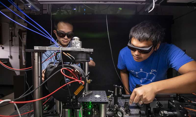 合著者Satcher Hsieh(左)和Chong Zu調(diào)整了成像系統(tǒng)的激光。當被激光激發(fā)時,NV中心會發(fā)出光子,其光度會通知研究人員他們所感測的當?shù)丨h(huán)境。圖片來源:Marilyn Sargent /伯克利實驗室