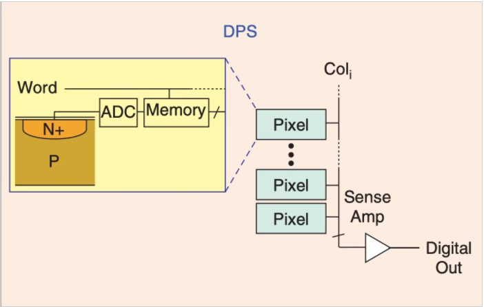 上圖顯示了APS(有源像素傳感器)架構(gòu)。在APS設(shè)備中,每個像素位置不僅包含光電二極管,而且包含放大器。一種稱為PPS(無源像素傳感器)的更簡單的體系結(jié)構(gòu)沒有將放大器集成到像素中。在DPS(數(shù)字像素傳感器)設(shè)備中,每個像素都有自己的模數(shù)轉(zhuǎn)換器和存儲塊。因此,DPS體系結(jié)構(gòu)中的像素輸出與光強(qiáng)度成比例的數(shù)字值。