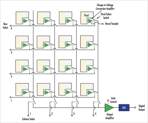 光電探測器的二維陣列用于感測入射光強(qiáng)度。光電探測器產(chǎn)生的電荷被轉(zhuǎn)換為電壓信號,并通過“行選擇”和“列選擇”開關(guān)陣列傳遞到輸出放大器。ADC用于數(shù)字化放大后的信號。