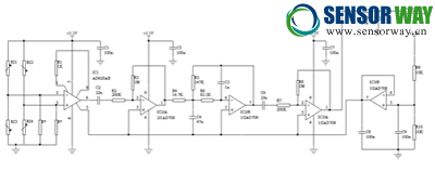 在本電路中,RS1、RS2、RS3和RS4是光刻在MEMS懸臂梁上的四可變電阻;R*是零位調(diào)整電阻;儀表放大 器AD620和C2組成前置級交流放大器,放大原始信號;AD708是高精度雙運(yùn)放芯片,IC2/A和R2、R3組成 反相比例放大器,目的是調(diào)準(zhǔn)中間級放大倍數(shù);IC/2B和R4、R5、C4、C5組成多路反饋、壓控、二節(jié)低通 有源濾波器,濾除高頻干擾波;IC/3A和R7、R8組成反相比例放大器,調(diào)整整個電路的輸出,也稱滿足刻 輸出。因為該套電路要和計算機(jī)接口,需要設(shè)計中心電壓,本設(shè)計的中心電壓為1.65V,IC3/B和R9、R10 組成跟隨電壓穩(wěn)壓電路,使IC3/B運(yùn)放輸出電路接口電位為1.65V,從而保持整個電路的中心電壓為1.65V。