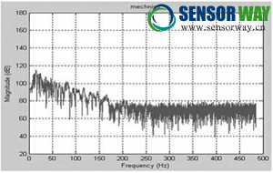 從圖中可明顯看出,壓阻式傳感器采集到的振動信號比動圈式采集到的振動信號內(nèi)容豐富,后者有明顯的信號丟失,而前者的信號幅度在環(huán)境等同條件下明顯增強(qiáng)。雖然作為無源傳感器的機(jī)械動圈式傳感器具有 低噪聲的特點,但壓阻式的信噪比要比動圈式大的多,達(dá)6dBv,后面的幅頻特性對比曲線將說到這一點。