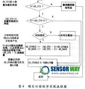 式(1)是加載到S1點(diǎn)天平的稱重值;式(2)是加載穩(wěn)定到S1點(diǎn)和進(jìn)行蠕變補(bǔ)償后天平的稱重值,式中載荷蠕變和受加載影響天平零點(diǎn)蠕變值同是ε。?蠕變跟蹤補(bǔ)償?shù)年P(guān)鍵是判斷和確定圖1所示的S1點(diǎn)、蠕變量ε與時(shí)間的關(guān)系,然后根據(jù)這一關(guān)系進(jìn)行蠕變補(bǔ)償。補(bǔ)償思路見(jiàn)圖4.圖4的前半段是確定S1點(diǎn),后半段是蠕變跟蹤處理。這里的關(guān)鍵問(wèn)題是如何確定蠕變跟蹤量和跟蹤時(shí)間的關(guān)系。圖1只定性地說(shuō)明傳感器的蠕變特性,但是,每個(gè)傳感器都有定量的特性,也就是蠕變量ε與時(shí)間的關(guān)系。只有確定這一關(guān)系,才能確定蠕變跟蹤時(shí)間和跟蹤量(圖4中的AD_STA3)。解決的辦法是在天平標(biāo)定時(shí)一起確定蠕變曲線。具體做法是:加載砝碼標(biāo)定時(shí)按規(guī)程測(cè)試蠕變特性,單片機(jī)先記錄下S1點(diǎn),并記錄每隔固定的時(shí)間段的當(dāng)前A/D值與S1點(diǎn)的差值,這就是該段時(shí)間的蠕變值。用軟件辦法記錄下這個(gè)傳感器蠕變量與時(shí)間的關(guān)系,然后再根據(jù)這一關(guān)系確定跟蹤量(AD_STA-3)和跟蹤時(shí)間。確定的原則是:固定的時(shí)間段蠕變量越大,跟蹤量(AD_STA-3)就越大和跟蹤間隔時(shí)間就越小。反之,跟蹤量(AD_STA-3)就越小和跟蹤間隔時(shí)間就越大。