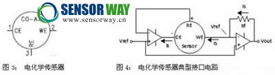 電化學(xué)式傳感器通常是電流方式輸出,信號(hào)的靈敏度從幾十nA/ppm到幾百nA/ppm,其數(shù)值根據(jù)氣體的種類不同而不同。另外,不同廠家的傳感器也略有差異。此類傳感器一般3個(gè)引腳,分別是工作電極(WE)/參考電極(RE)/對(duì)電極(CE)。 工作電極與對(duì)電極之間流動(dòng)的電流與氣體濃度成比例。參考電極沒有電極流動(dòng),只是提供一個(gè)參考電壓。對(duì)于不同氣體傳感器,參考電壓會(huì)有所不同,設(shè)計(jì)后端電路時(shí)要仔細(xì)閱讀產(chǎn)品手冊。
