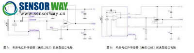 熱勢電是紅外傳感器中重要的一種,其傳感器及其典型接口電路如圖7和圖8所示,框中部分是傳感器,內(nèi)部集成有JFET和CMOS運(yùn)放兩種形式。對(duì)外部均需要精密運(yùn)算放大器對(duì)輸出的信號(hào)進(jìn)行調(diào)理。溫度的變化對(duì)于此類傳感器影響較大,一般有溫度校正的環(huán)節(jié)。