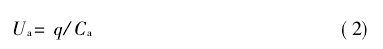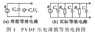 式中q為極板上聚集的電荷量;Ca為PVDF壓電薄膜兩個表面間的等效電容。所以,可以把PVDF壓電薄膜看成是一個等效電荷源和一個電容器相并聯(lián),如圖1(a)所示。在實際測量中,PVDF壓電薄膜傳感器還必須考慮外接電路的電容和電阻,因此,PVDF壓電薄膜傳感器的實際等效電路[4]如圖1(b)所示。在此等效電路中,傳感器的絕緣電阻與前置放大器的輸入電阻相并聯(lián),為了保證傳感器的低頻響應(yīng),盡量減少靜態(tài)測量誤差,要求傳感器的絕緣電阻應(yīng)保持在1 013Ψ以上,才能使電荷泄露減少到滿足精度要求。同時前置放大器要有較大的輸入電阻,以防止傳感器的電荷通過輸入電路泄露。