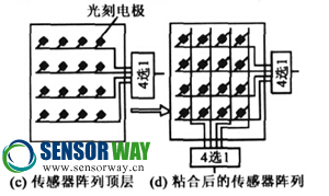 (2)PVDF壓電薄膜的兩面分別與頂、底層的光刻電極相連接,連接材料為銀粉導電膠,同時在絕緣薄膜的空白處涂上502粘合劑,干燥幾分鐘后,迅速將三層粘合在一起,粘合后的陣列傳感器如圖2(d)所示。