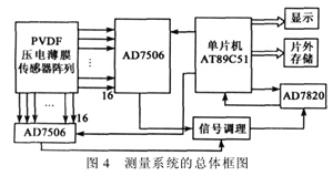 系統(tǒng)的工作原理是在單片機的控制下,由切換電路完成對傳感單元的選擇,被選擇的PVDF壓電薄膜傳感器經(jīng)電荷-電壓轉(zhuǎn)換及相應(yīng)的信號調(diào)理電路變成0~5V的電壓信號,再經(jīng)過AD7820進行模數(shù)轉(zhuǎn)換,轉(zhuǎn)換結(jié)果通過AT89C51暫存于片外存儲單元(本文采用靜態(tài)RAM芯片62256),并在檢測完畢后,通過RS232串行通信接口傳送到計算機進行處理與顯示。測量系統(tǒng)的結(jié)構(gòu)框圖如圖4所示。