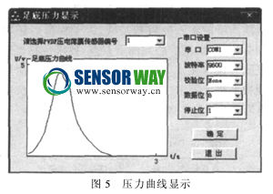 數(shù)據(jù)采集和模數(shù)轉(zhuǎn)換是借助DP-51PROC單片機綜合仿真實驗儀來完成的。采集的數(shù)據(jù)通過RS-232串口通信傳送至計算機進行處理與顯示。本文用VC+ +6.0編程實現(xiàn)串口通信,并進行數(shù)據(jù)處理。測試時,由人體足底前掌部對傳感器陣列施加一動態(tài)壓力,經(jīng)過數(shù)據(jù)處理,可獲取每只傳感器對應(yīng)的壓力曲線。圖5為某一時刻,第1只PVDF壓電薄膜傳感器(位于第5跖骨)對應(yīng)的壓力曲線。僅從圖形上相比較,該結(jié)果與文獻記載的足底壓力曲線相似。一旦對PVDF壓電薄膜進行標定,便能準確測量出該部位在任一時刻的壓力大小。