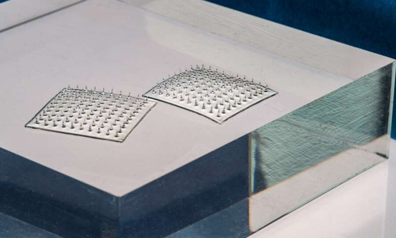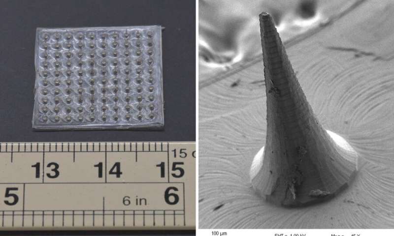 在左側(cè),您可以看到具有100針的微針陣列的示例。右邊是單針的SEM圖像。圖片來源:麻省理工學院