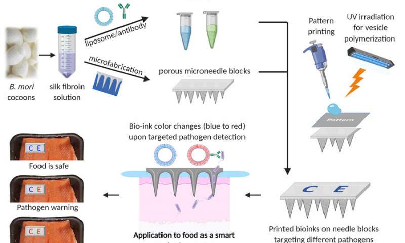 該示意圖說明了擬議的食品質(zhì)量監(jiān)控系統(tǒng),該系統(tǒng)使用帶有打印生物墨水的絲綢微針陣列作為比色傳感器。圖片來源:麻省理工學院