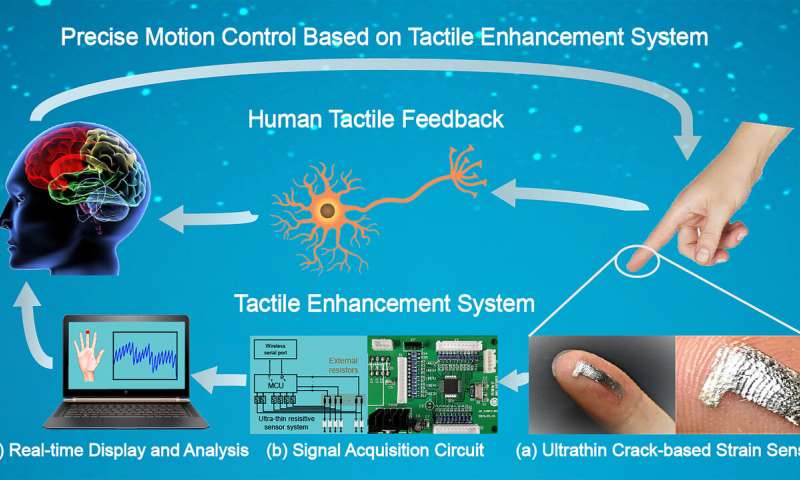 在本周的《應(yīng)用物理評(píng)論》上,科學(xué)家報(bào)告了基于高靈敏度傳感器的新型觸覺(jué)增強(qiáng)系統(tǒng)的開(kāi)發(fā)。該傳感器具有卓越的靈敏度,使佩戴者能夠檢測(cè)出羽毛的光筆,花瓣的觸感,落在手指上的水滴,甚至是太細(xì)小的電線都看不到。