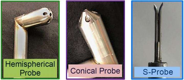 NIST設(shè)計了兩種新的皮托管探頭(左和中),一個的傳感表面為圓錐形,另一個的表面為半球形。探針有五個孔或端口。比較在五個端口中每個端口獲得的壓力讀數(shù),技術(shù)人員可以計算流速。一種較舊的皮托管,稱為S探針(右),有兩個面向相反方向的端口。圖片來源:NIST