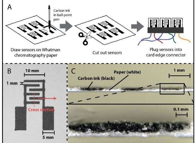 (A)紙基電子氣體傳感器(PEGS)的制造。碳電極用圓珠筆和切刀繪圖儀打印在WhatmanTM纖維素色譜1紙上,可快速制作所需幾何形狀的原型。打印完成后,將傳感器切割并放置在卡式邊緣連接器內(nèi)以進(jìn)行表征。(B)單個PEGS的俯視圖,該P(yáng)EGS由兩個帶有三個手指的電極組成,每個手指之間的間距為1 mm。(C)跨三個手指的PEGS的橫截面(B中的紅色虛線)。碳墨水(黑色)部分滲入紙張(白色)。圖片來源:ACS Sensors(2019)。DOI:10.1021 / acssensors.9b00555