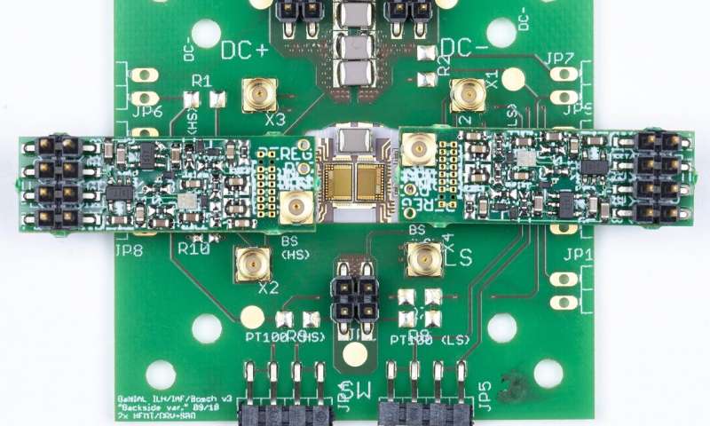 在電動(dòng)汽車中,需要在有限的空間內(nèi)集成許多小型高效的系統(tǒng)。所示的電壓轉(zhuǎn)換器基于尺寸為4 x 3mm2的GaN電源IC。圖片來(lái)源:Fraunhofer IAF