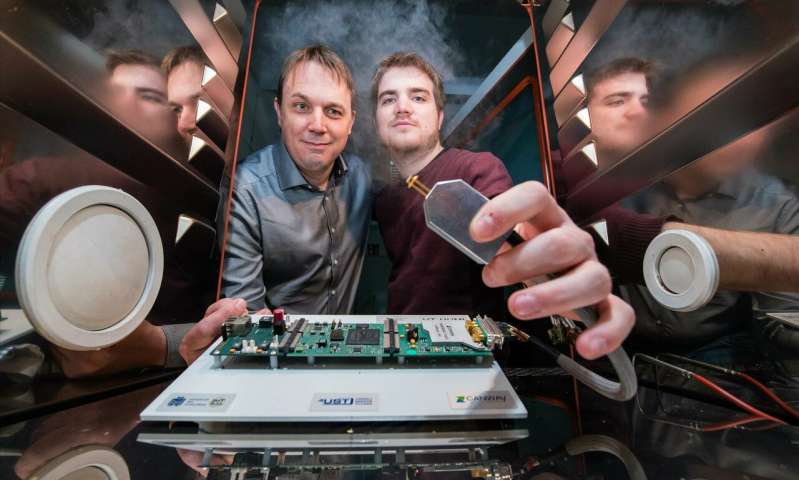 一個(gè)即使在高溫工業(yè)烤箱中也能精確測(cè)量空氣濕度的傳感器系統(tǒng):由AndreasSchütze教授領(lǐng)導(dǎo)的研究團(tuán)隊(duì)的項(xiàng)目經(jīng)理Tilman Sauerwald(左)和博士生Henrik Lensch。(照片來源:Oliver Dietze