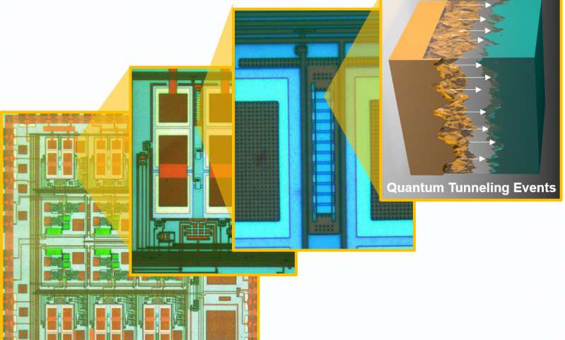 量子隧穿傳感器芯片組和匹配的Fowler-Nordheim隧穿勢(shì)壘的顯微照片。圖片提供:圣路易斯華盛頓大學(xué)麥凱維工程學(xué)院Chakrabartty實(shí)驗(yàn)室