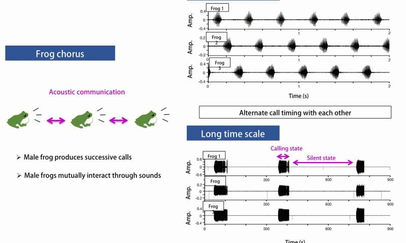 主要作者Ikyu Aihara表示:“我們以確定性的方式對呼叫狀態(tài)和沉默狀態(tài)進行了建模,同時以隨機的方式對往返于它們之間的過渡進行了建模。這些模型定性地再現(xiàn)了實際青蛙的呼叫模式,從而有助于設(shè)計自主的分布式通信系統(tǒng)!