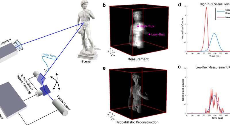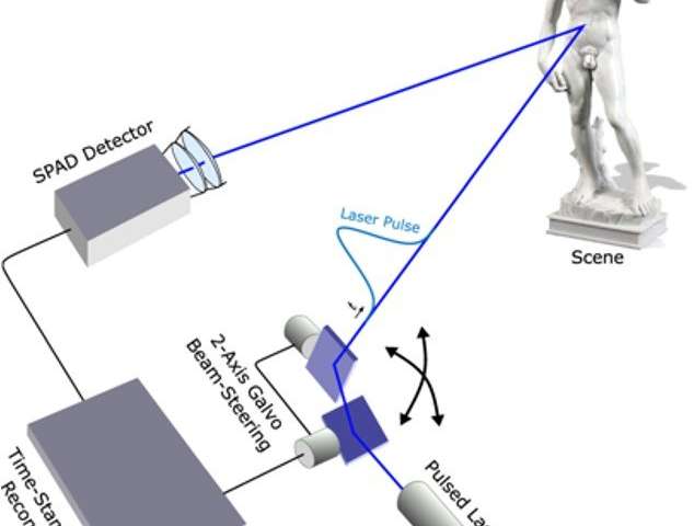 用于3D成像的實(shí)驗(yàn)硬件。示意圖顯示了“大衛(wèi)雕像”的場景,照明源以及圖像重建的時間戳記過程。圖片來源:Scientific Reports,Doi:10.1038 / s41598-018-35212-x