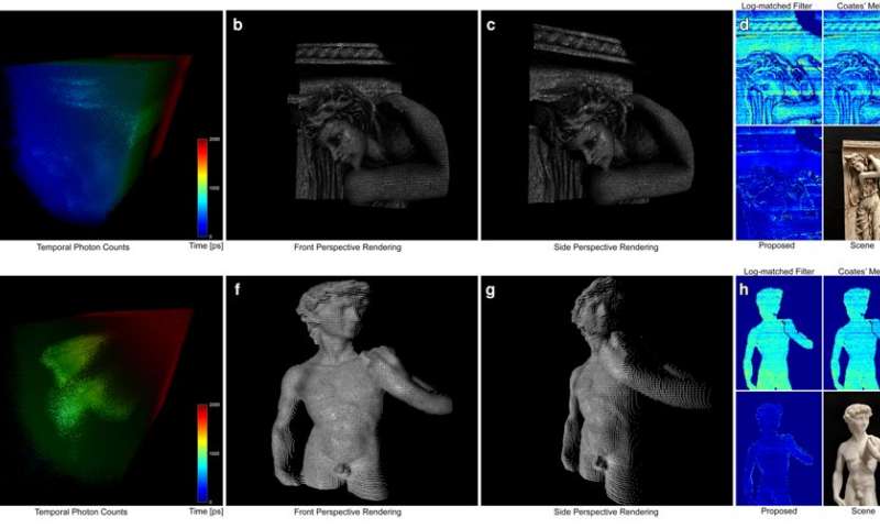 實(shí)驗(yàn)重建。記錄的光子計(jì)數(shù)的時空分布。對(a,e)進(jìn)行處理以估計(jì)包含深度和反照率信息的3D點(diǎn)云(b,c,f,g),此處針對兩個不同場景進(jìn)行了顯示((d,h)中所示的照片)。用顏色編碼的誤差圖(d,h)直接比較幾種深度估計(jì)技術(shù)的結(jié)果,包括對數(shù)匹配濾波,Coates方法和高斯擬合(在高通量測量中),以及所提出的方法。圖片來源:Scientific Reports,Doi:10.1038 / s41598-018-35212-x