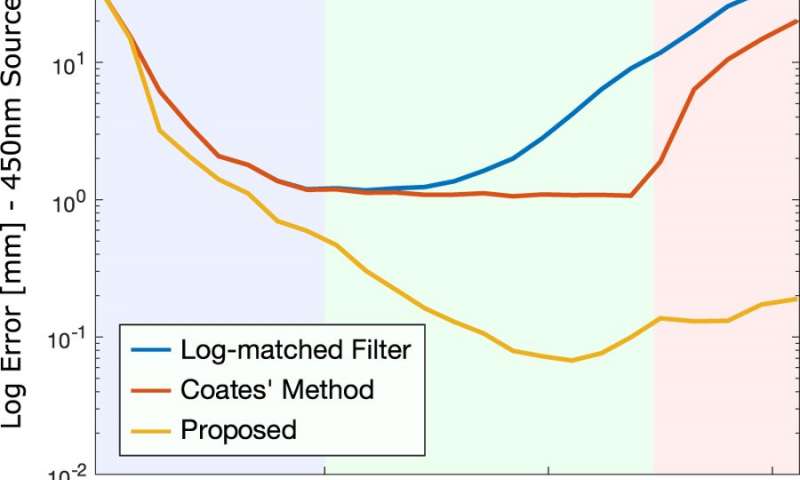 最佳光子計(jì)數(shù)方案。450 nm Alphalas LD-450-50激光器(FWHM為90 ps)的變化光子數(shù)的深度重建精度。比較了傳統(tǒng)的對數(shù)匹配濾波器,Coates方法和提出的方法。最佳的光子數(shù)量平均位于每個脈沖平均檢測到1個光子的非常規(guī)區(qū)域附近,與脈沖響應(yīng)無關(guān),并且直方圖bin寬度范圍很廣。圖片來源:Scientific Reports,Doi:10.1038 / s41598-018-35212-x