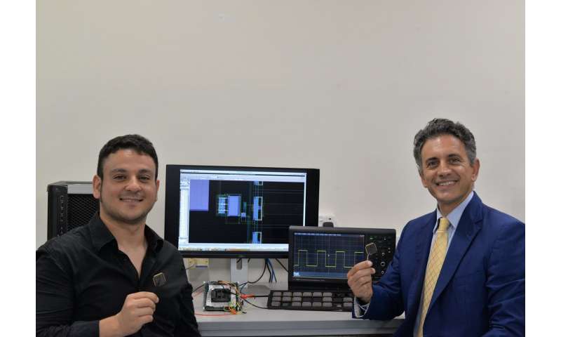 NUS研究人員發(fā)明了一種低成本的“無電池”喚醒定時(shí)器,可將IoT傳感器節(jié)點(diǎn)的功耗降低1000倍,從而有助于持久運(yùn)行。 喚醒定時(shí)器嵌入在測(cè)試芯片中,并放置在較大的封裝中(由兩個(gè)研究人員持有),以便于測(cè)試和表征。 左起:新加坡國立大學(xué)工程學(xué)院的Orazio Aiello博士和Massimo Alioto副教授學(xué)分:新加坡國立大學(xué)