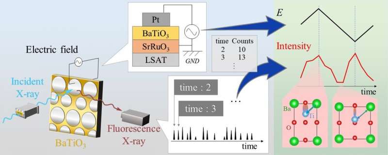 來自BaTiO_3薄膜的熒光X射線由帶有時(shí)間標(biāo)記信息的固態(tài)檢測(cè)器檢測(cè),該時(shí)間標(biāo)記信息與薄膜上的施加電壓同步以獲得光譜的時(shí)間變化。圖片來源:廣島大學(xué)中島信男