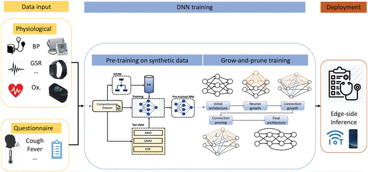 這些數(shù)據是從意大利北部一家醫(yī)院的健康、無癥狀和有癥狀的個體中收集的。醫(yī)生在那家醫(yī)院給它們貼上標簽,以實現(xiàn)有監(jiān)督的機器學習。然后使用基于我們的增長和修剪神經網絡合成程序的數(shù)據訓練神經網絡。