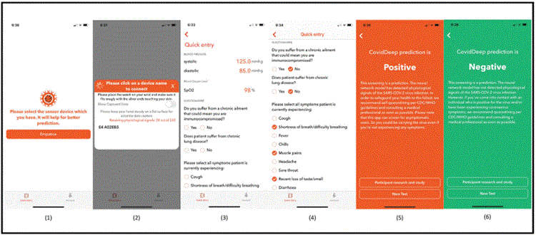 CovidDeep 應用程序用戶體驗的屏幕截圖。