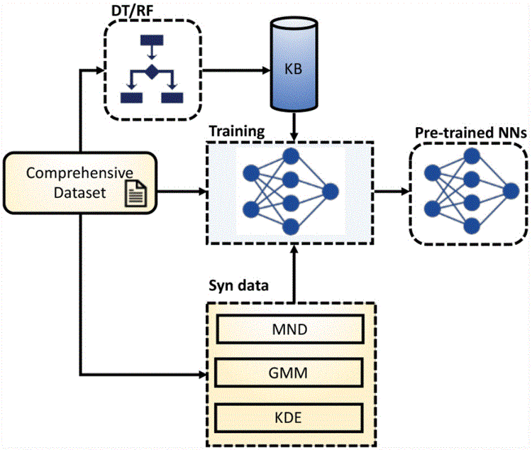 使用合成數(shù)據集(DT/RF:決策樹/隨機森林,NN:神經網絡,KB:知識庫)對 DNN 模型進行預訓練的示意圖。