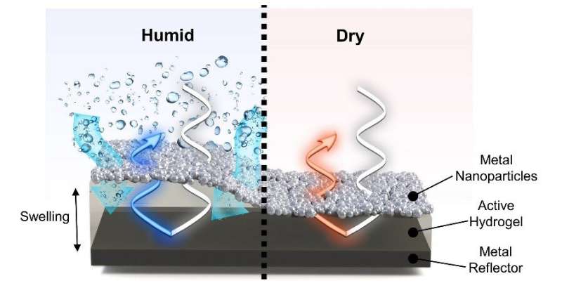 研究小組制造了一種比色傳感器,該傳感器由金屬-水凝膠-金屬結構組成,使用無序金屬納米顆粒層(殼聚糖水凝膠)和反射基板。當外界濕度變化時,由于殼聚糖水凝膠在潮濕狀態(tài)下膨脹,在干燥狀態(tài)下反復收縮的特性,傳感器的諧振頻率也會發(fā)生變化。