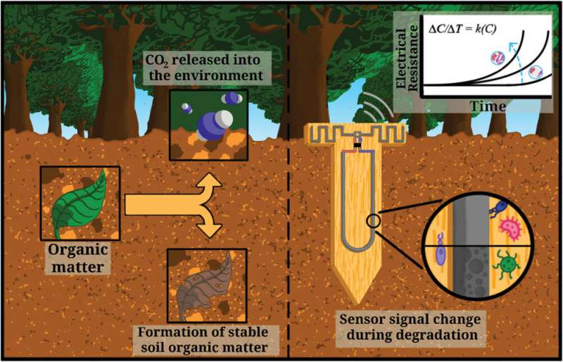 分解傳感器的概念,其中可生物降解的導(dǎo)電痕量的侵蝕速率與土壤中的微生物活動(dòng)相關(guān)。