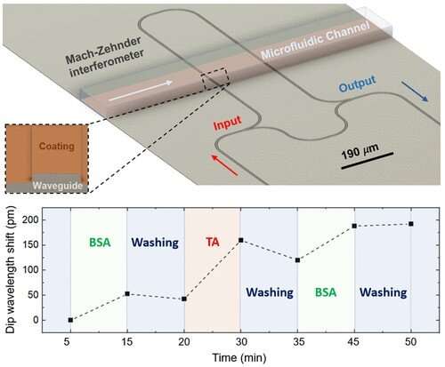 在實(shí)驗(yàn)中,研究人員將蛋白質(zhì)和單寧酸薄膜逐層沉積到PIC的敏感表面上。通過微流體通道泵送牛血清白蛋白后,他們用去離子水沖洗掉多余的白蛋白,泵入單寧酸,重新涂覆蛋白質(zhì)涂層,并使用干涉儀的光學(xué)讀數(shù)實(shí)時(shí)分析每層的沉積過程。