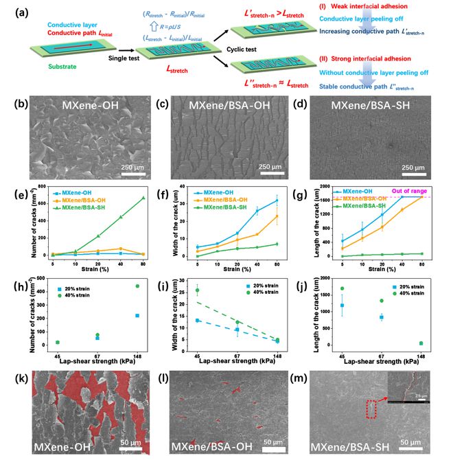為解釋界面黏附強(qiáng)度影響傳感器耐久性的工作機(jī)理,作者針對具有不同界面黏附的傳感器的導(dǎo)電層進(jìn)行了掃描電鏡表征和分析。圖4表明,隨著界面黏附強(qiáng)度的提升,導(dǎo)電層在固定應(yīng)變下產(chǎn)生的裂痕大小(長度和寬度)減小,但是數(shù)目明顯增多。這種現(xiàn)象是傳感器在保持較高拉伸性的前提下大幅提升拉伸性的原因。在1000次的循環(huán)測試之后,具有較弱界面黏附的傳感器產(chǎn)生了明顯的導(dǎo)電層剝落,而強(qiáng)界面黏附展示了穩(wěn)定的導(dǎo)電層與裂痕維持能力,這是傳感器耐久性提升的根本原因。