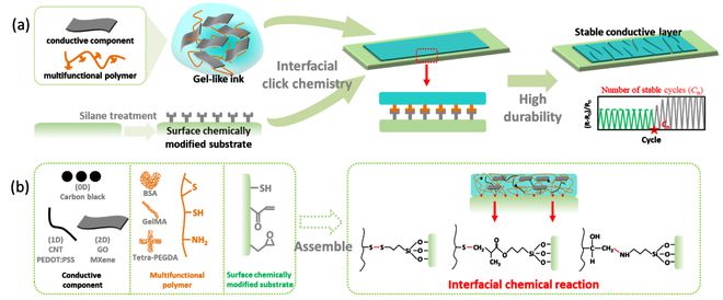 圖2 基于“點(diǎn)擊化學(xué)”構(gòu)建導(dǎo)電層與基底間強(qiáng)界面黏附推動傳感器具有高耐久性。