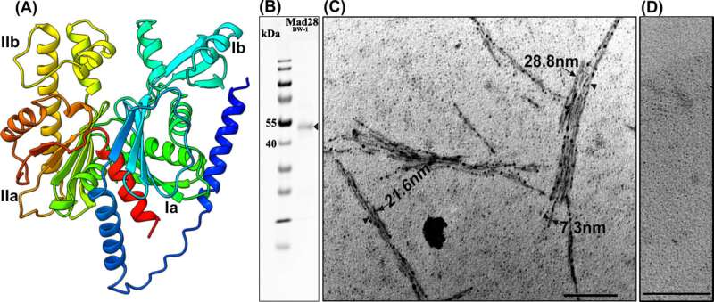 (A) Alphafold預(yù)測(cè)的BW-28的Mad1三維結(jié)構(gòu)模型。結(jié)構(gòu)中標(biāo)明了四個(gè)肌動(dòng)蛋白結(jié)構(gòu)域 Ia、Ib、IIa 和 IIb。(B) 純化的 N 端 His 標(biāo)簽的 Mad28 的 SDS-PAGEBW-1型來自大腸桿菌。(C)Mad28的體外聚合BW-1型在存在 ATP-γ-S 且沒有 ATP (D) 的情況下,通過 TEM 可視化。比例尺,100 nm。圖片來源:mBio (2023)。DOI: 10.1128/mbio.01649-23
