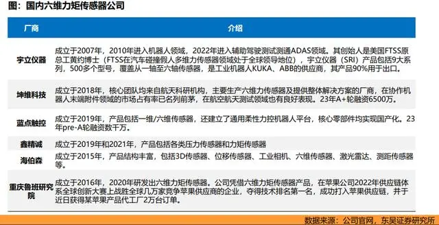 六維力矩傳感器壁壘較高,國(guó)產(chǎn)六維力矩傳感器與外資主流傳感器仍存在差距。從競(jìng)爭(zhēng)格局看,美國(guó)的ATI產(chǎn)品類型多,性能良好,為Kuka、ABB、安川等協(xié)作機(jī)器人廠商提供核心產(chǎn)品;德國(guó)的HBM、ME,均可自產(chǎn)應(yīng)變片;瑞士Kistler是電壓式的佼佼者。國(guó)產(chǎn)廠商中,宇立儀器、坤維科技、鑫精誠(chéng)、海伯森、藍(lán)點(diǎn)觸控、神源生智能、瑞爾特測(cè)控等已有相關(guān)的產(chǎn)品落地并進(jìn)入產(chǎn)業(yè)化應(yīng)用,新進(jìn)入者東華測(cè)試、昊志機(jī)電、埃力智能等已初步具備六維力矩傳感器的生產(chǎn)能力,部分產(chǎn)品已開始送樣測(cè)試。不過,曾朵紅等人表示,六維傳感器的壁壘更多在于工藝,無明顯卡脖子環(huán)節(jié),中國(guó)廠商在中低端產(chǎn)品上已突破,且產(chǎn)品性價(jià)比高,且更多資本進(jìn)入該領(lǐng)域加速技術(shù)迭代,中國(guó)廠商優(yōu)勢(shì)明顯。