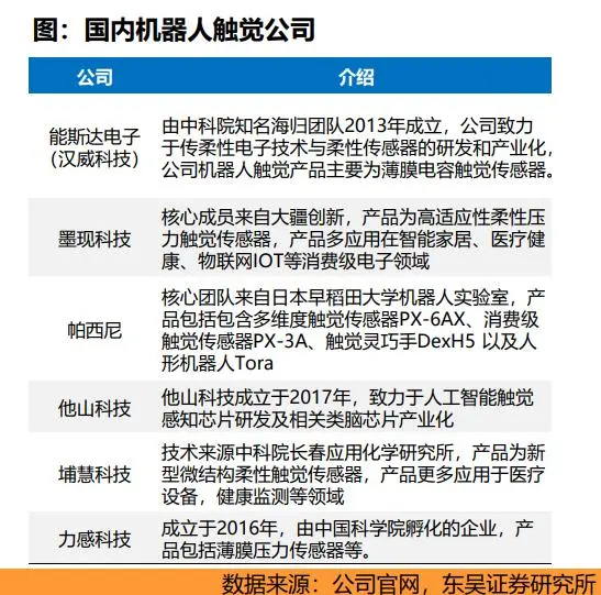 目前機(jī)器人觸覺傳感器市場(chǎng)主要由美國(guó)企業(yè)占據(jù)。根據(jù)QY Research,2022年全球前五大廠商占據(jù)76%份額,分別為美國(guó)Tekscan、Pressure Profile Systems、Sensor Products、德國(guó)Weiss Robotics、美國(guó)Syn Touch。國(guó)內(nèi)企業(yè)規(guī)模尚小,其中漢威科技子公司能斯達(dá)主要生產(chǎn)薄膜電容觸覺傳感器,可應(yīng)用于機(jī)器人身體,產(chǎn)品成熟;初創(chuàng)型公司帕西尼致力于用列陣式柔性觸覺傳感器應(yīng)用于機(jī)器人領(lǐng)域,技術(shù)積累相對(duì)扎實(shí);此外墨現(xiàn)科技、他山科技、埔慧科技、力感科技也有相關(guān)布局。