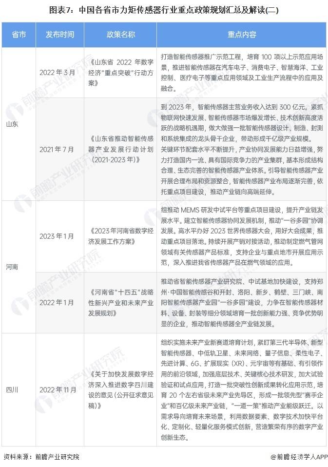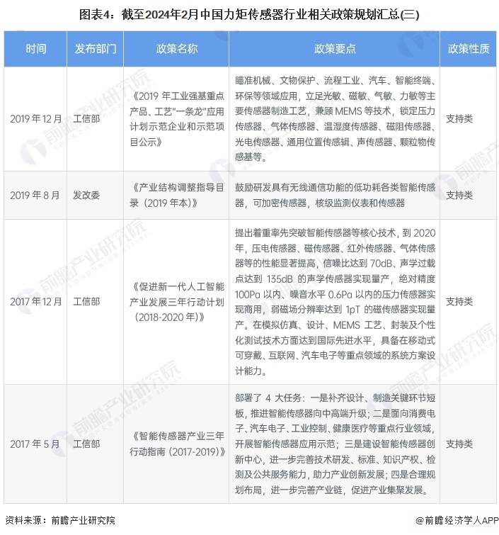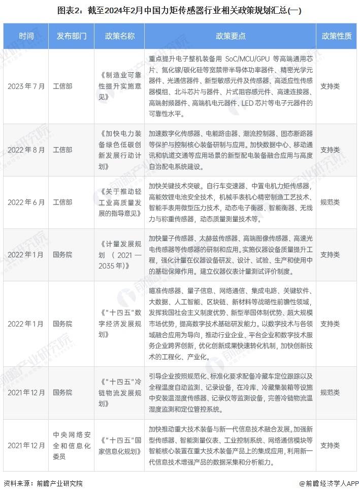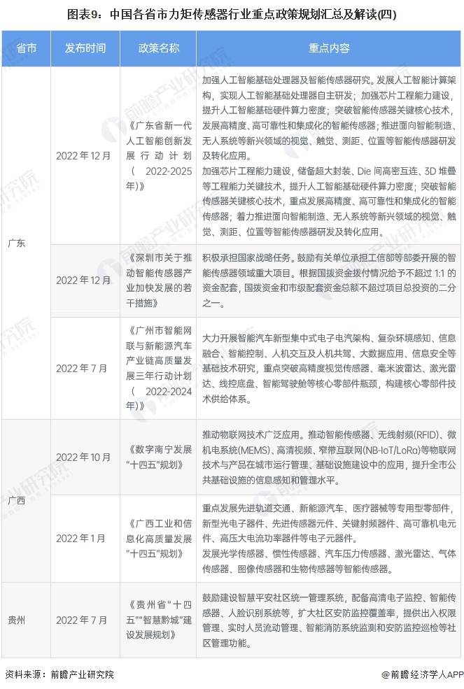 各地政策在傳感器方面發(fā)布的政策較多。盡管針對力矩傳感器的具體政策條文,但是力矩傳感器在高端裝備等領(lǐng)域應(yīng)用更加廣泛,因此各地政策主要鼓勵(lì)企業(yè)加強(qiáng)新型傳感技術(shù)研發(fā),高端、智能傳感器技術(shù)的突破!逗邶埥 笆奈濉睌(shù)字經(jīng)濟(jì)發(fā)展規(guī)劃》中提出推進(jìn)光學(xué)傳感器、慣性傳感器、壓電傳感器、電感傳感器等功能集成與規(guī)模應(yīng)用,實(shí)現(xiàn)智能傳感器一體化生產(chǎn)!稄V西工業(yè)和信息化高質(zhì)量發(fā)展“十四五”規(guī)劃》中提出發(fā)展光學(xué)傳感器、慣性傳感器、汽車壓力傳感器、激光雷達(dá)、氣體傳感器、圖像傳感器和生物傳感器等智能傳感器。