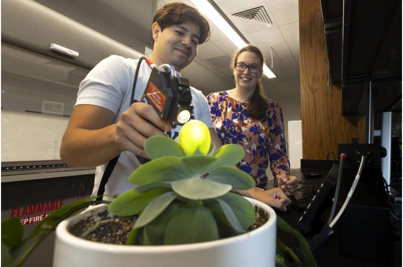 馬里奧・索托(左),作物、土壤與環(huán)境科學(xué)系碩士研究生,與阿肯色大學(xué)農(nóng)業(yè)分部及戴爾・邦珀斯農(nóng)業(yè)、食品與生命科學(xué)學(xué)院精準農(nóng)業(yè)助理教授奧雷莉・龐塞特,共同展示一項用于測量除草劑對植物作用效果的研究設(shè)備。(圖片來源:阿肯色大學(xué)農(nóng)業(yè)分部)